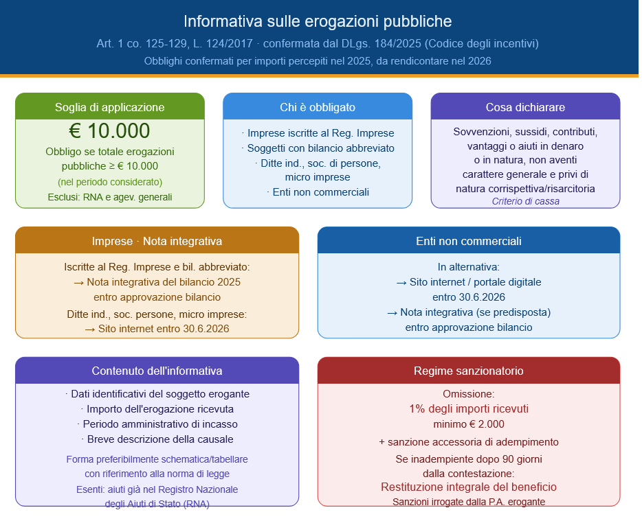 I soggetti che esercitano le attività di cui all’art. 2195 c.c. e che, quindi, sono obbligati all’iscrizione nel Registro delle imprese devono pubblicare gli importi e le informazioni relativi a sovvenzioni, sussidi, vantaggi, contributi o aiuti, agli stessi effettivamente erogati dalle Pubbliche Amministrazioni, nella Nota integrativa del bilancio d’esercizio e dell’eventuale (cioè soltanto ove esistente) bilancio consolidato.